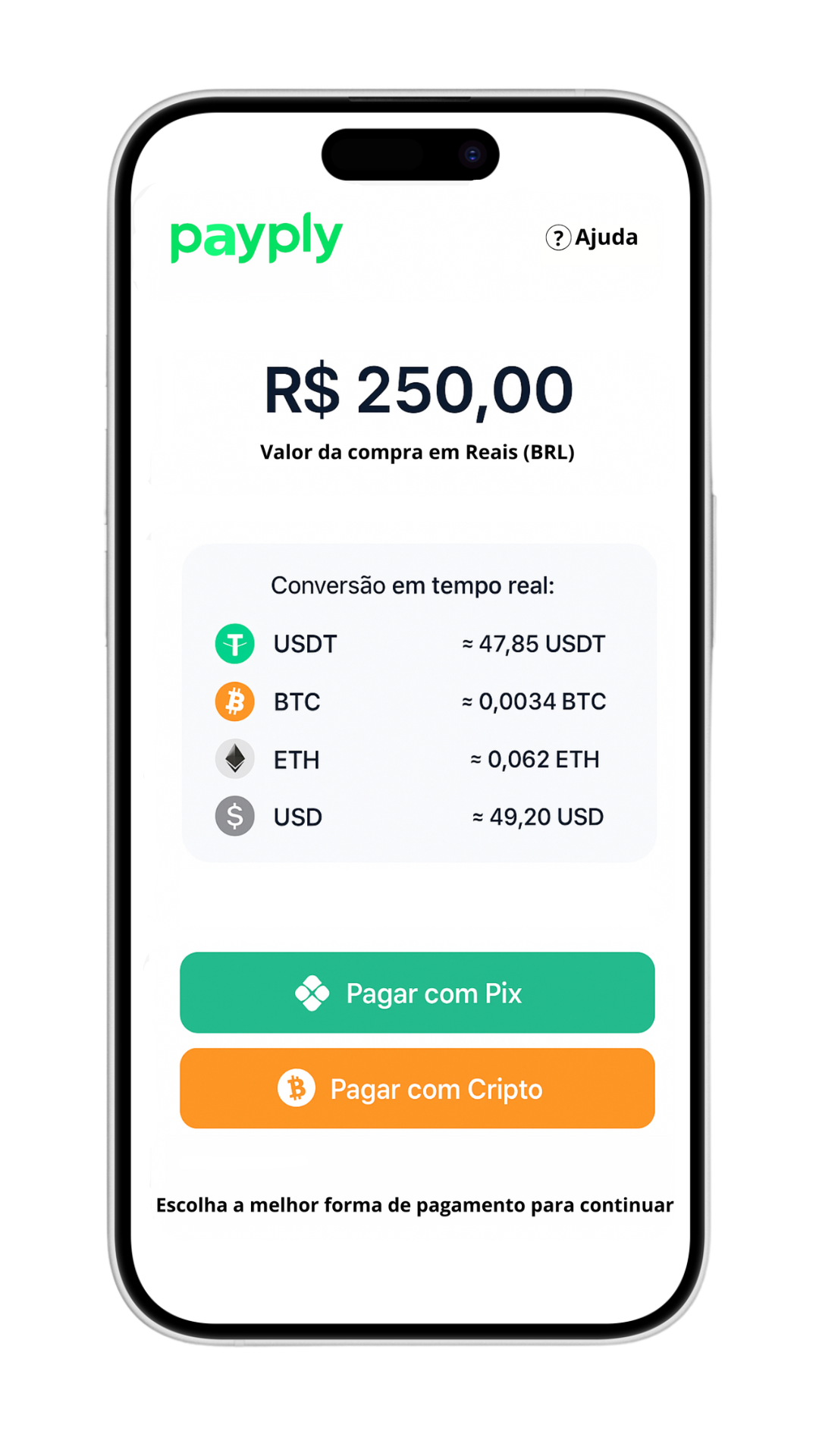 Com o Payply você centraliza todas as formas de pagamento em uma única plataforma. Seus clientes podem escolher entre criptomoedas, Pix ou cartão de crédito e débito, enquanto você acompanha tudo em tempo real pelo app. Mais opções significam mais conveniência para quem paga e mais oportunidades de vendas para você.