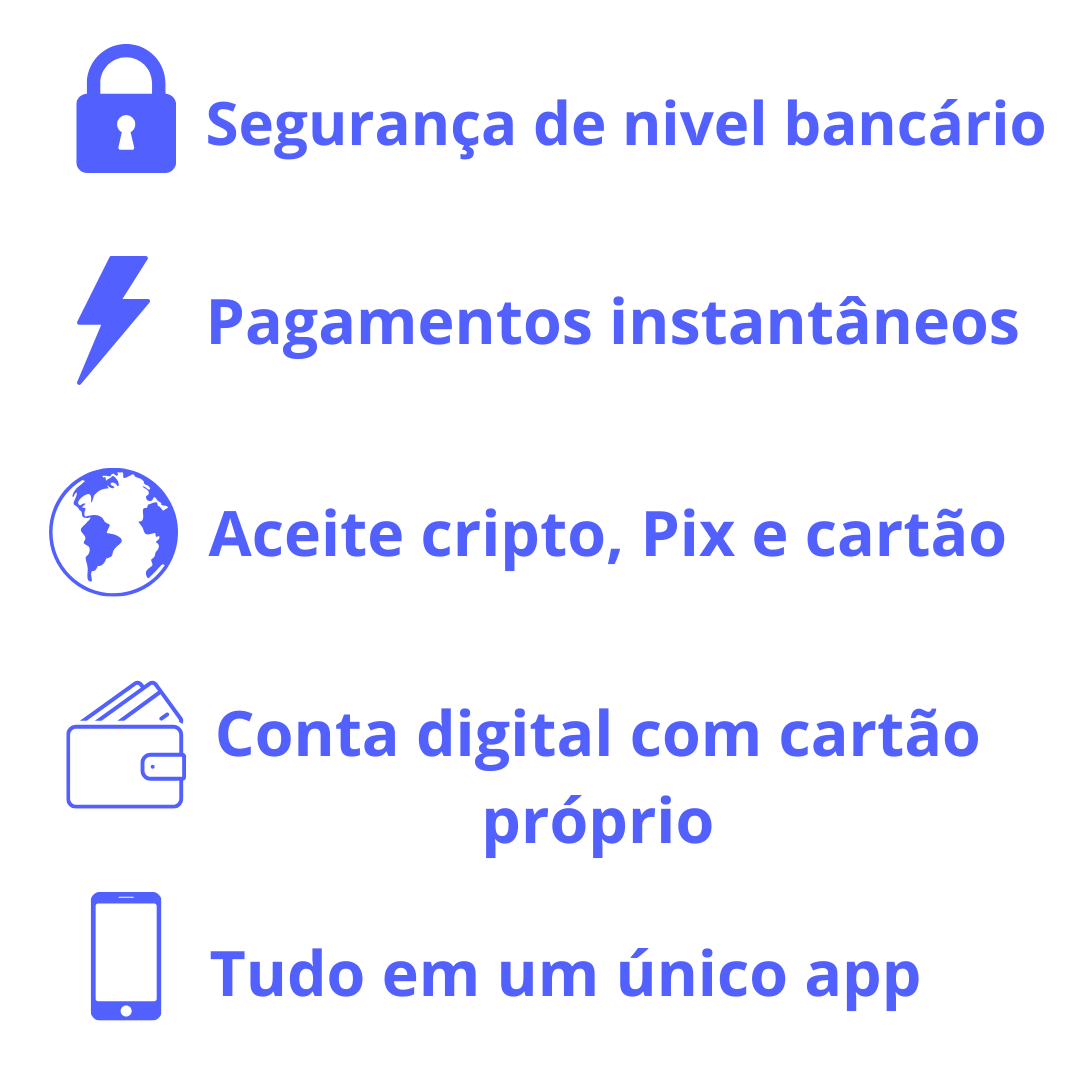 Receba com cripto, Pix e cartão em um só lugar.